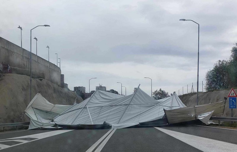 Rijeka - Na D403, ispod ZTC-a, u smjeru od novog kontejnerskog terminala prema kružnom toku, promet zahtijeva dodatni oprez. Naime, orkanska bura otpuhala je šator koji je završio na prometnici.